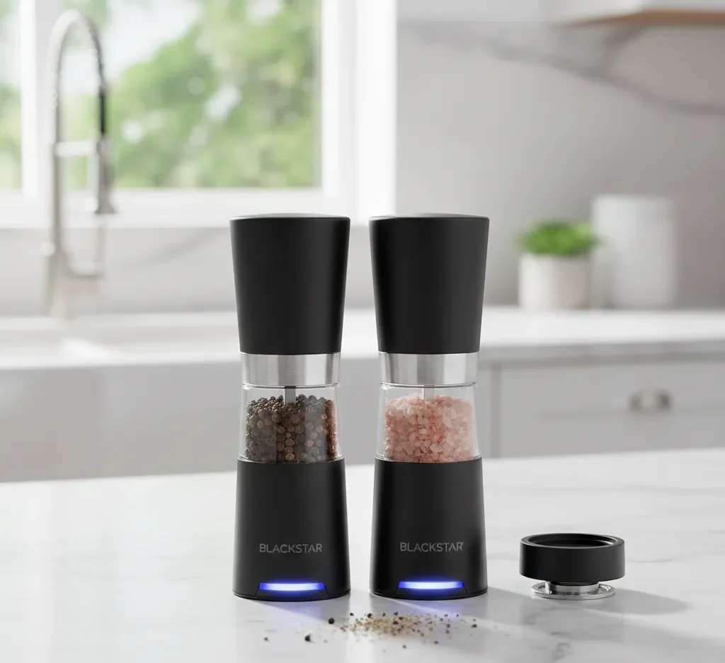 Upgrade your dining experience with this automatic grinder set featuring adjustable coarseness and LED lighting.