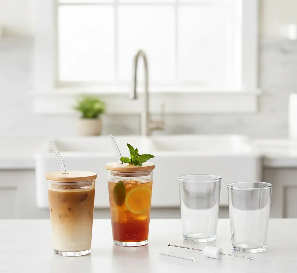 Glass Cups with Bamboo Lids & Glass Straws (4-Piece Set – 16oz)Glass Cups with Bamboo Lids & Glass Straws (4-Piece Set – 16oz)