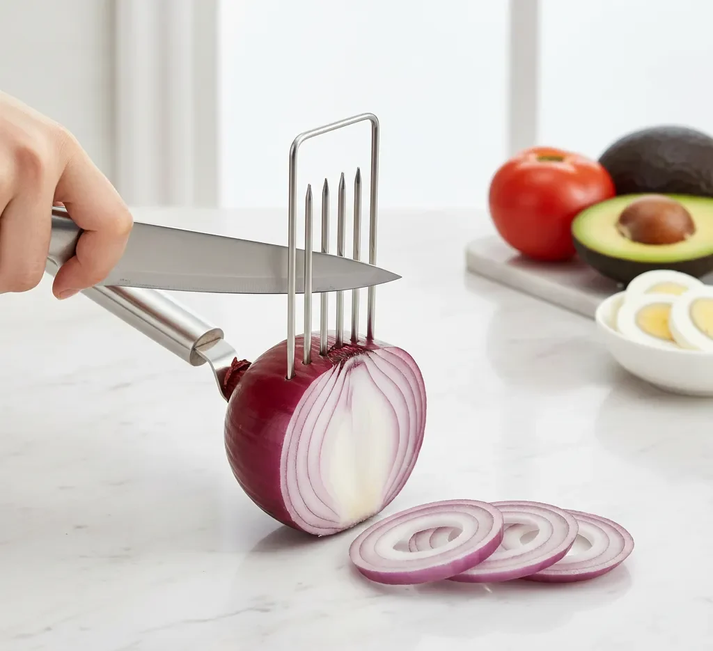 + Free ShippingSafely slice onions, tomatoes, and vegetables evenly with this stainless steel onion holder.