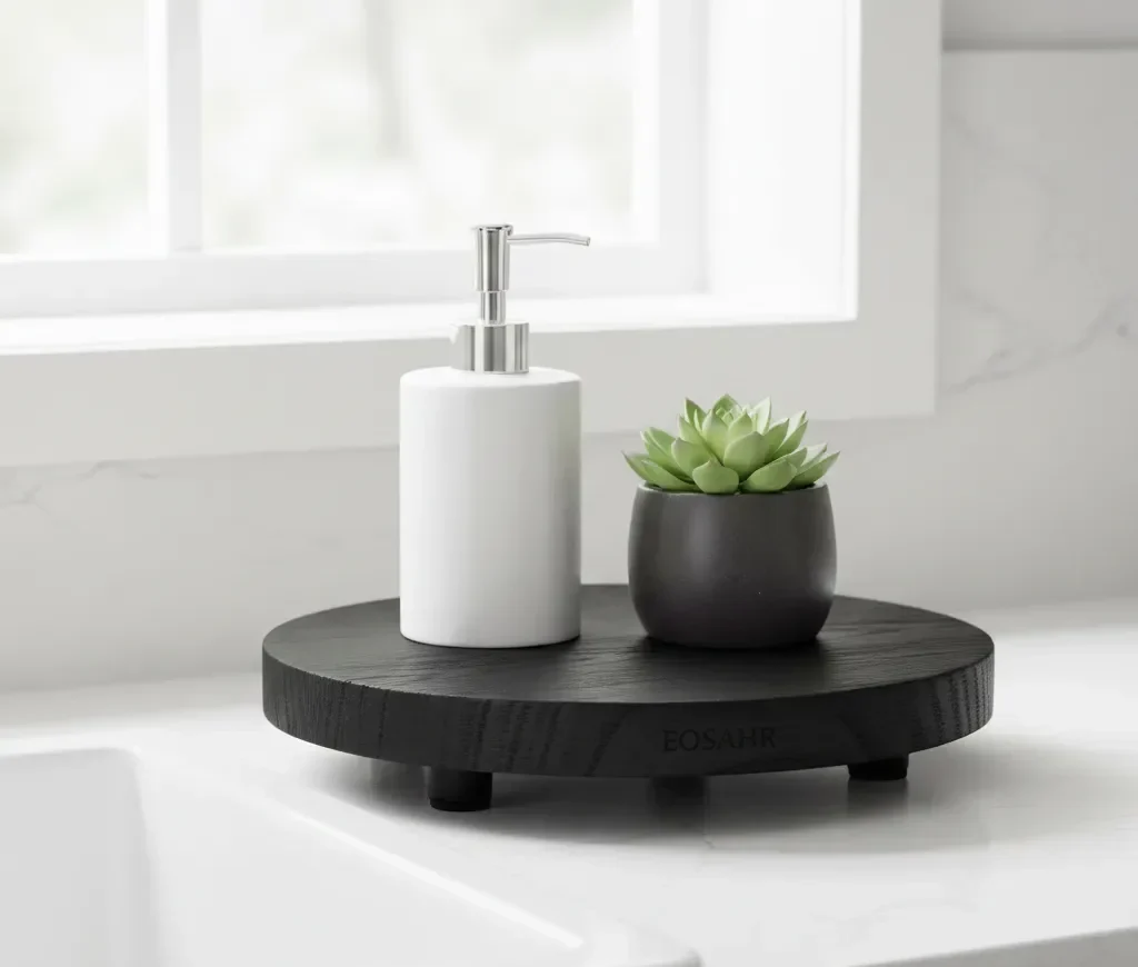 This farmhouse-style wooden riser adds height and elegance to kitchen counters and home decor displays.